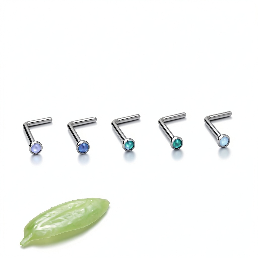 Ruifan ASTM F136 titanium nose rings combine premium materials with elegant design, featuring jeweled opal tops in a mix of colours including white, pink, purple, blue, and green. Each set includes five pieces, with bar thickness of 20G (0.8mm), bar length of 6mm (1/4 inch), and opal top diameter of 2mm. Crafted from nickel-free and lead-free ASTM F136 titanium, these nose rings are hypoallergenic, lightweight, and smoother than stainless steel, ensuring comfort and safety for nose piercings. Available in L-shaped and screw styles to suit different preferences and piercing types.